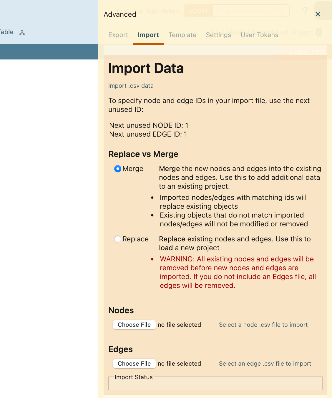 Once you have an exported CSV for nodes and edges, you can add data using the CSV as a format guide.